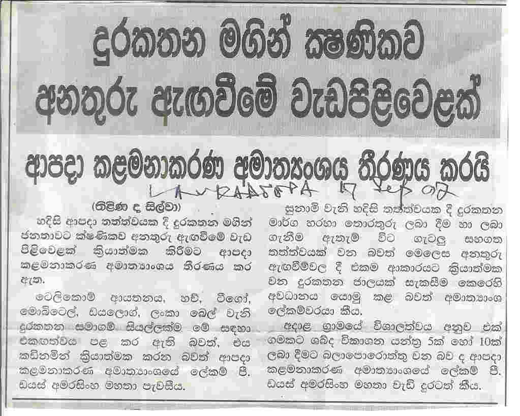 A direct result of the Ministry of DMHR and LIRNEasia meeting on September 7th.