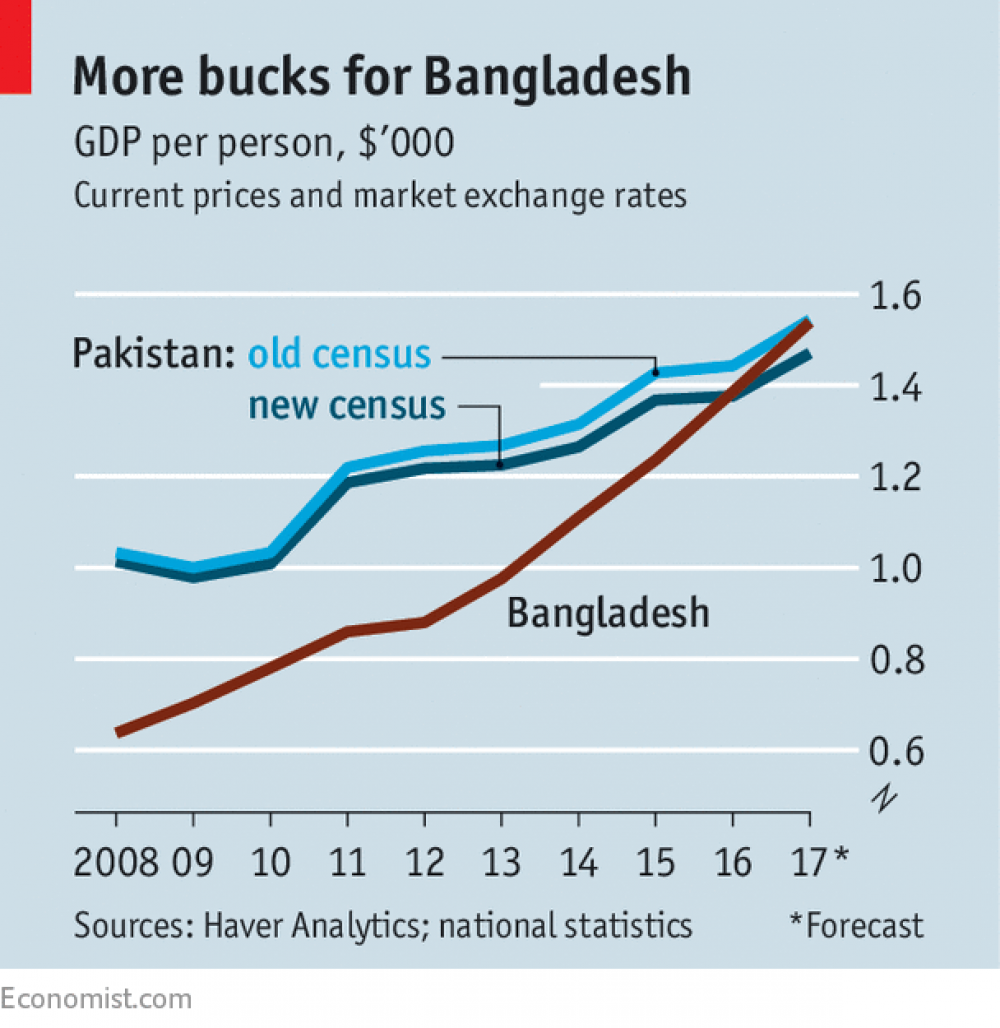 The economist celebrates Bangladesh’s achievements, caused in part by Pakistan’s census showing that it has more people than earlier estimated, thus decreasing the per-capita GDP. When the new population numbers are applied to the indicators that contribute to the ITU’s 2016 ICT Development Index, it is likely that the current virtual tie between Bangladesh and Pakistan will change to a significant lead for Bangladesh.