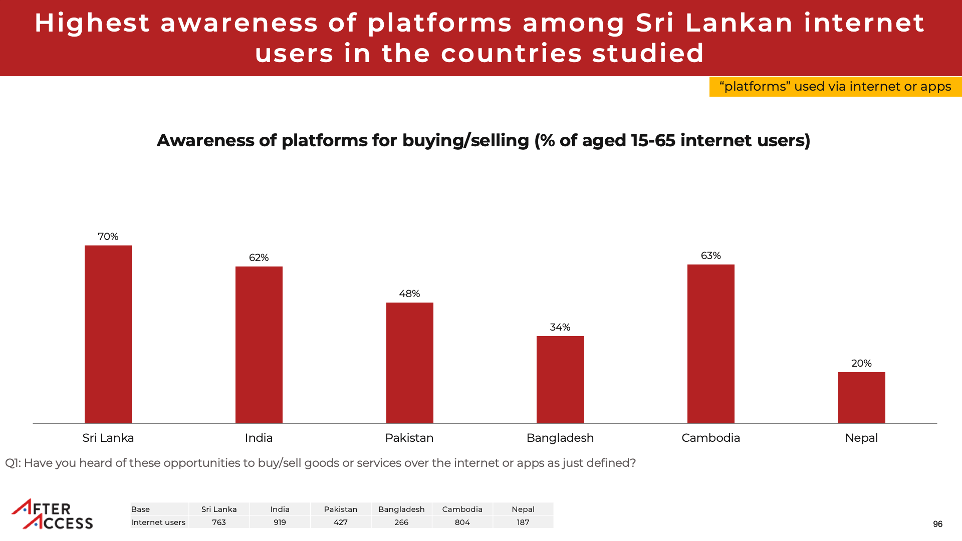 70% Internet users in Sri Lanka said they had heard of platforms for buying and selling goods and services online. This was the highest reported number in the Asian countries surveyed