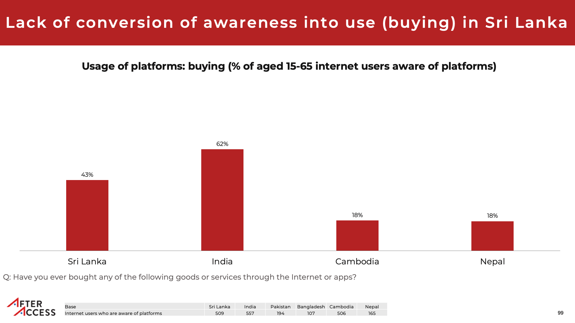 Only 43% of Sri Lankans aware of platforms for buying and selling goods and service online (1.6 million people) said they ever used these platforms for buying.