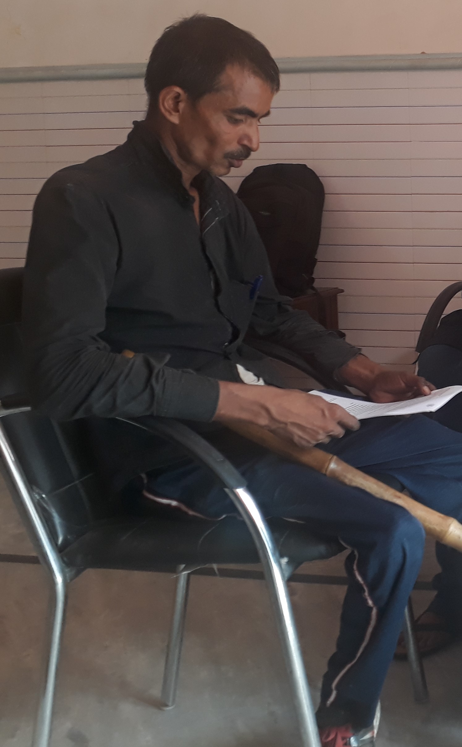 Rajan (name changed) reads a document while his make-shift bamboo walking stick rests on the chair he is seated on