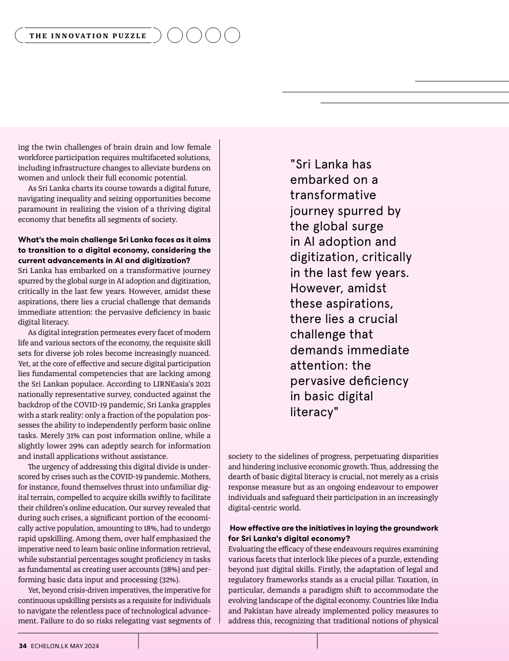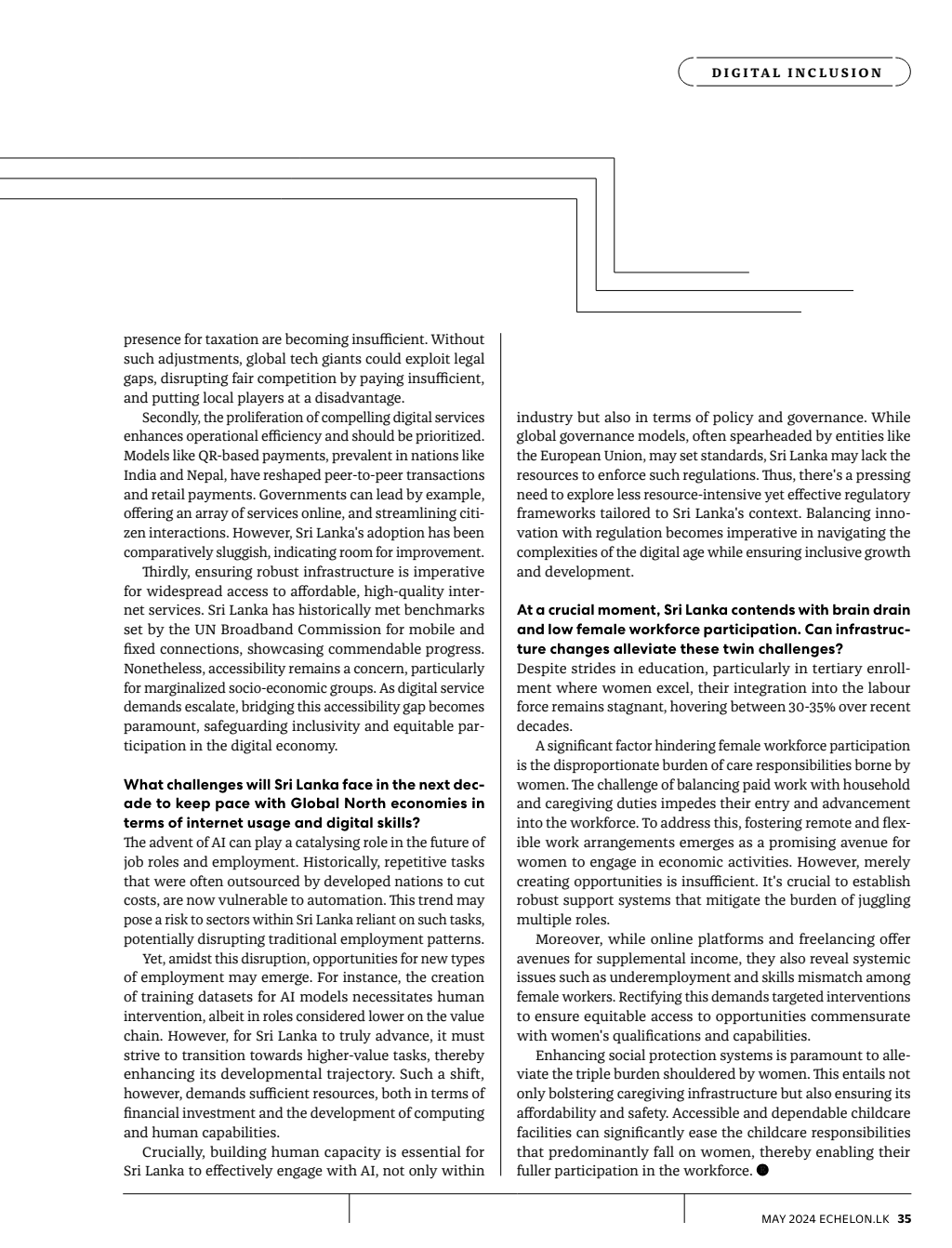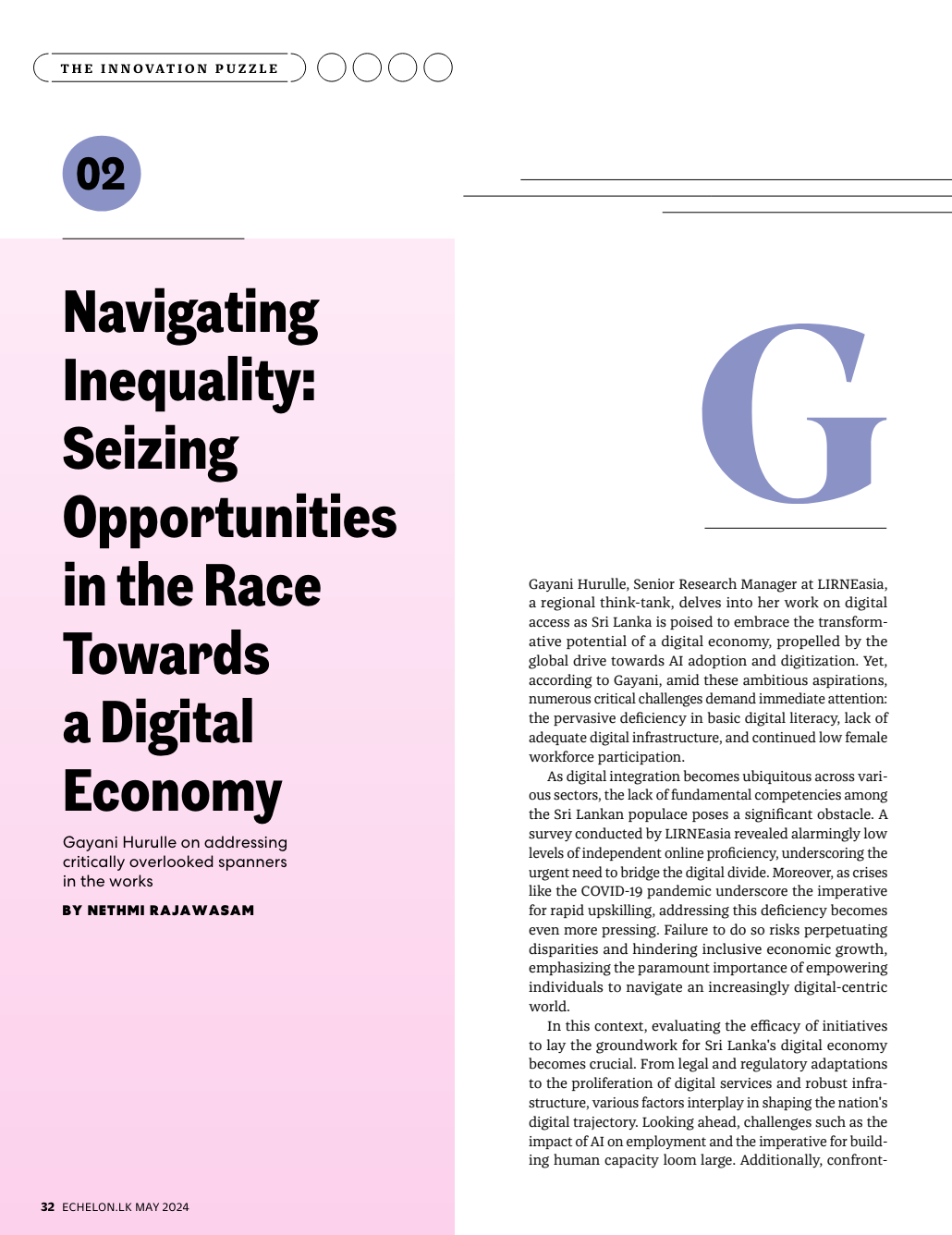 Senior Research Manager Gayani Hurulle, in an interview with Echelon for their May issue, discussed Sri Lanka’s readiness for a digital economy. Six experts were interviewed regarding Sri Lanka’s innovation landscape, providing insights into essential components for economic transformation, challenges in digital readiness, parallels with regional models, the intersection of law and technology, climate financing opportunities, and hurdles within the startup ecosystem.