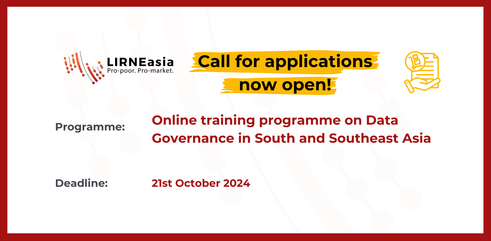The training is free of charge, but participants must commit to two half days of online training and participate in post course evaluation processes. The training aims to build a cohort of policy intellectuals working in the area of data governance in South Asia and South East Asia, and as such participants are expected to commit to being part of this network in the future.