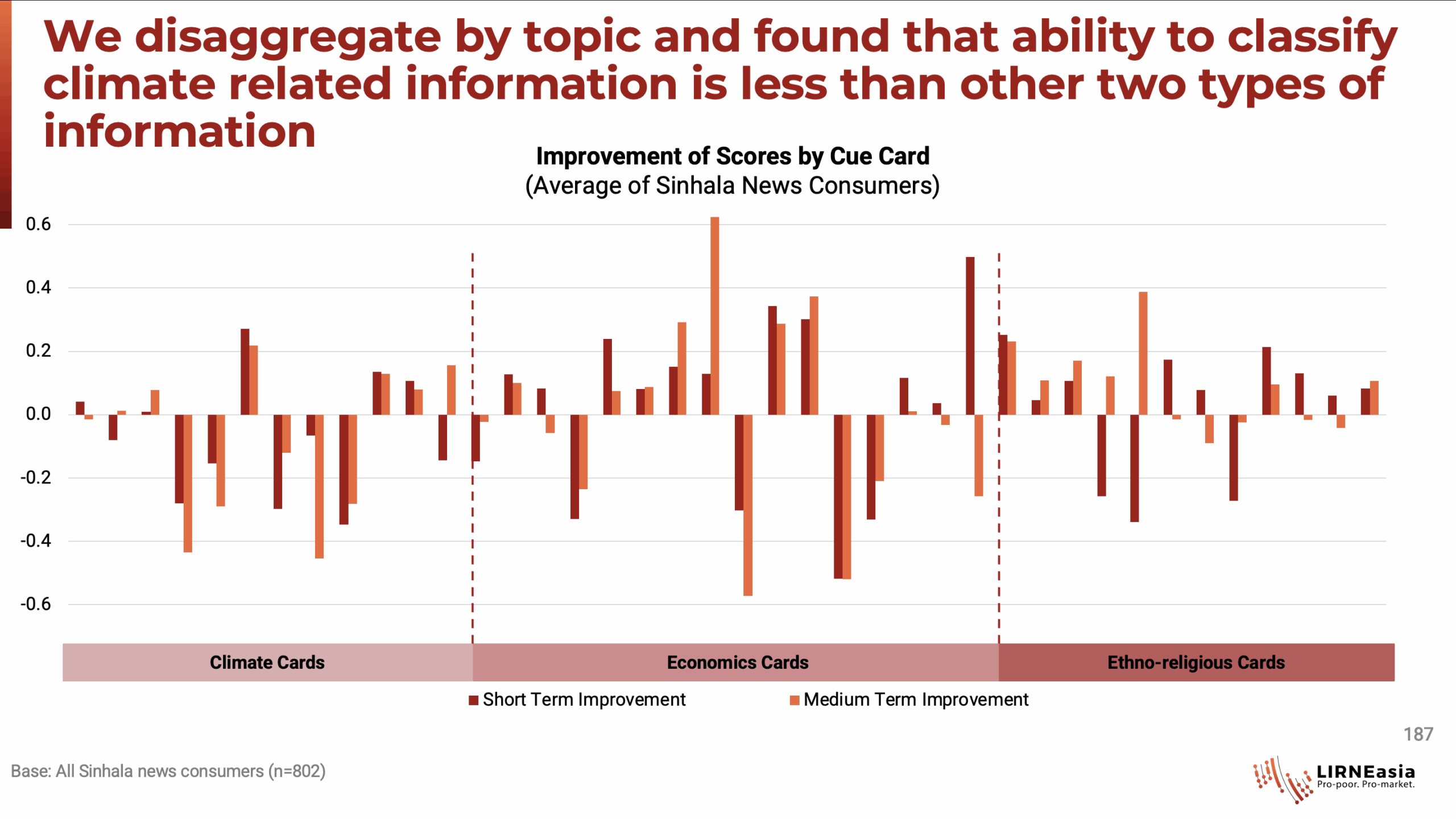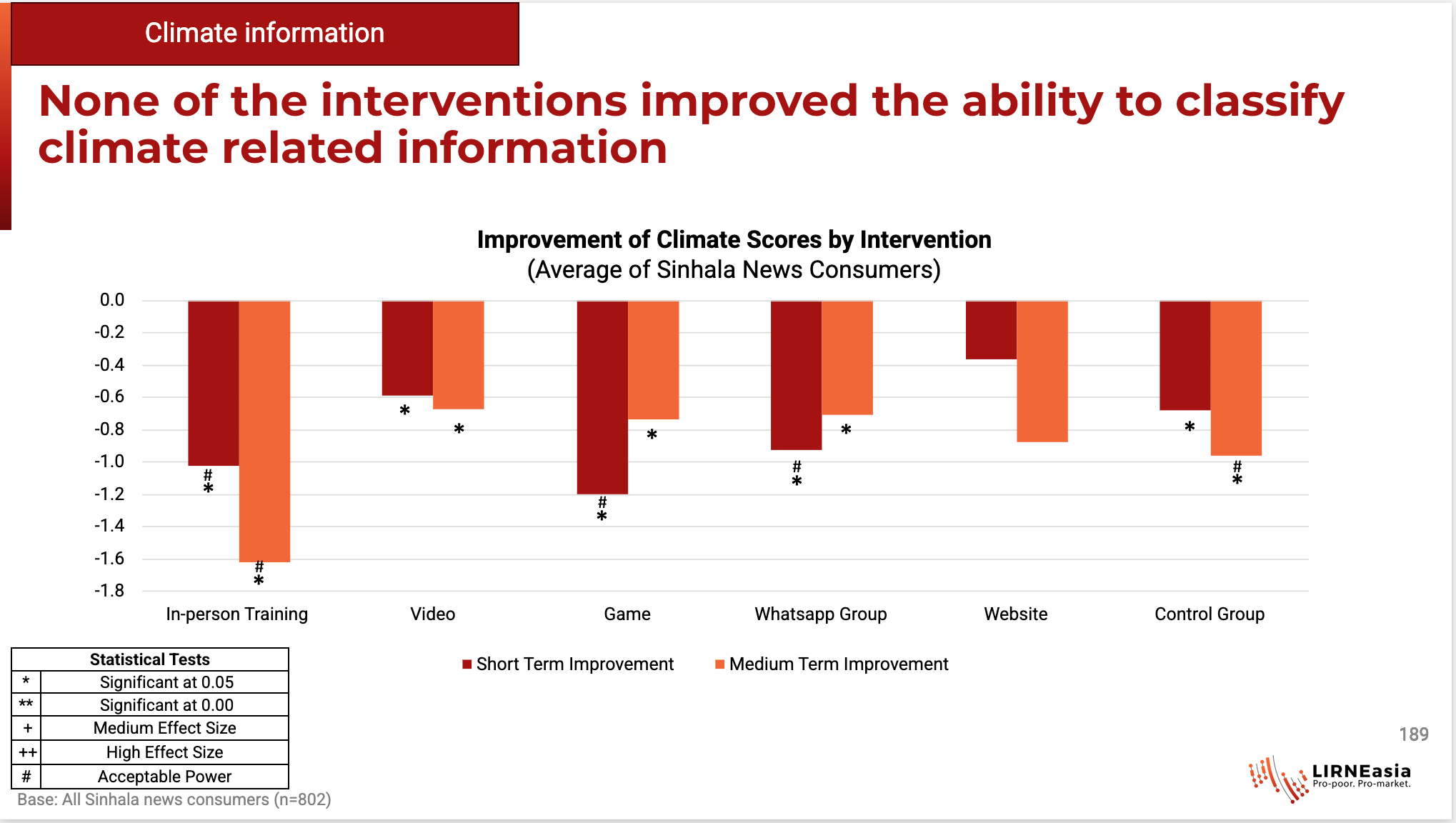 In summary, LIRNEasia’s experimental study highlights that people find it especially difficult to identify climate-related misinformation — and that current intervention methods may not only be ineffective but could even have a negative impact. This critical insight points to an urgent need for new strategies to strengthen public resilience against climate misinformation in Sri Lanka.