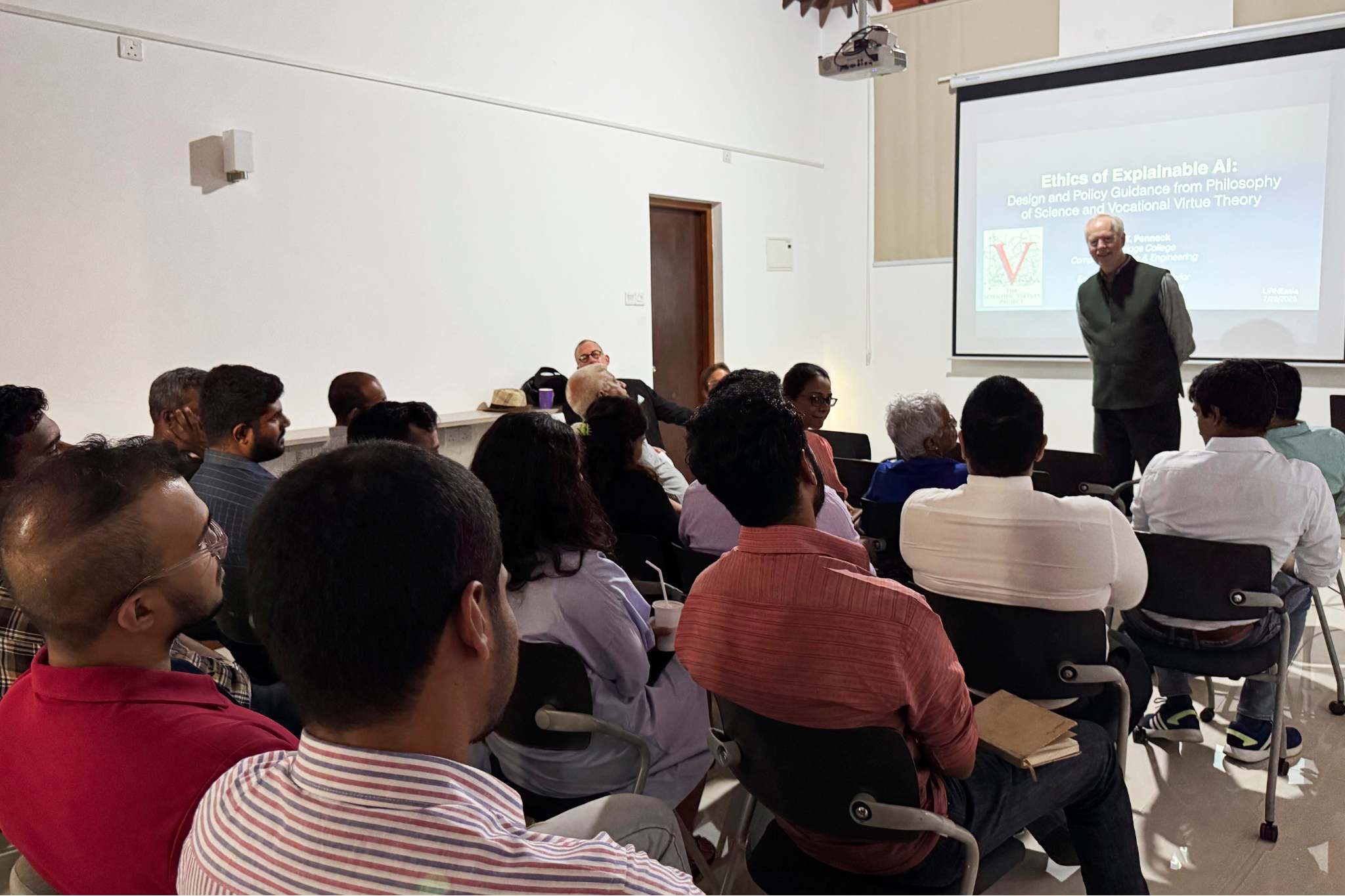 The discussion centered on the theme “Ethics of Explainable AI: Design and Policy Guidance from Philosophy of Science and Vocational Virtue Theory.” Many AI systems, especially large language models, are often described as “black boxes” because their inner workings are not fully understood, even by the people who build them. This raises a variety of concerns. Dr. Pennock brought up the popular Silicon Valley slogan “move fast and break things” but added the thought, “If we move too fast, what might we break?” During his presentation, he suggested two values that must be embedded into AI systems: 1) Explainability – the ability to map the ways in which AI models deliver predictions; 2) Escape Key – the ability to easily transfer control of a system from an AI to a human (e.g., a manual override for self-driving cars).
