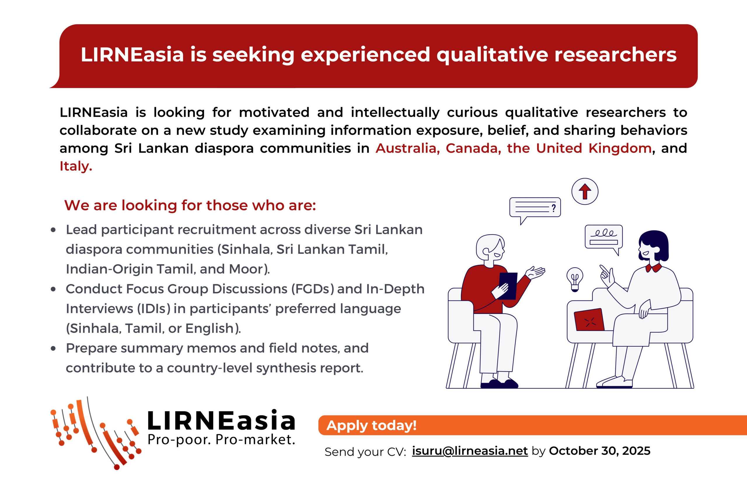 Please email your CV, a brief note on your relevant experience, and language competencies to isuru@lirneasia.net with the subject line “Qualitative Researchers ” by October 30, 2025.