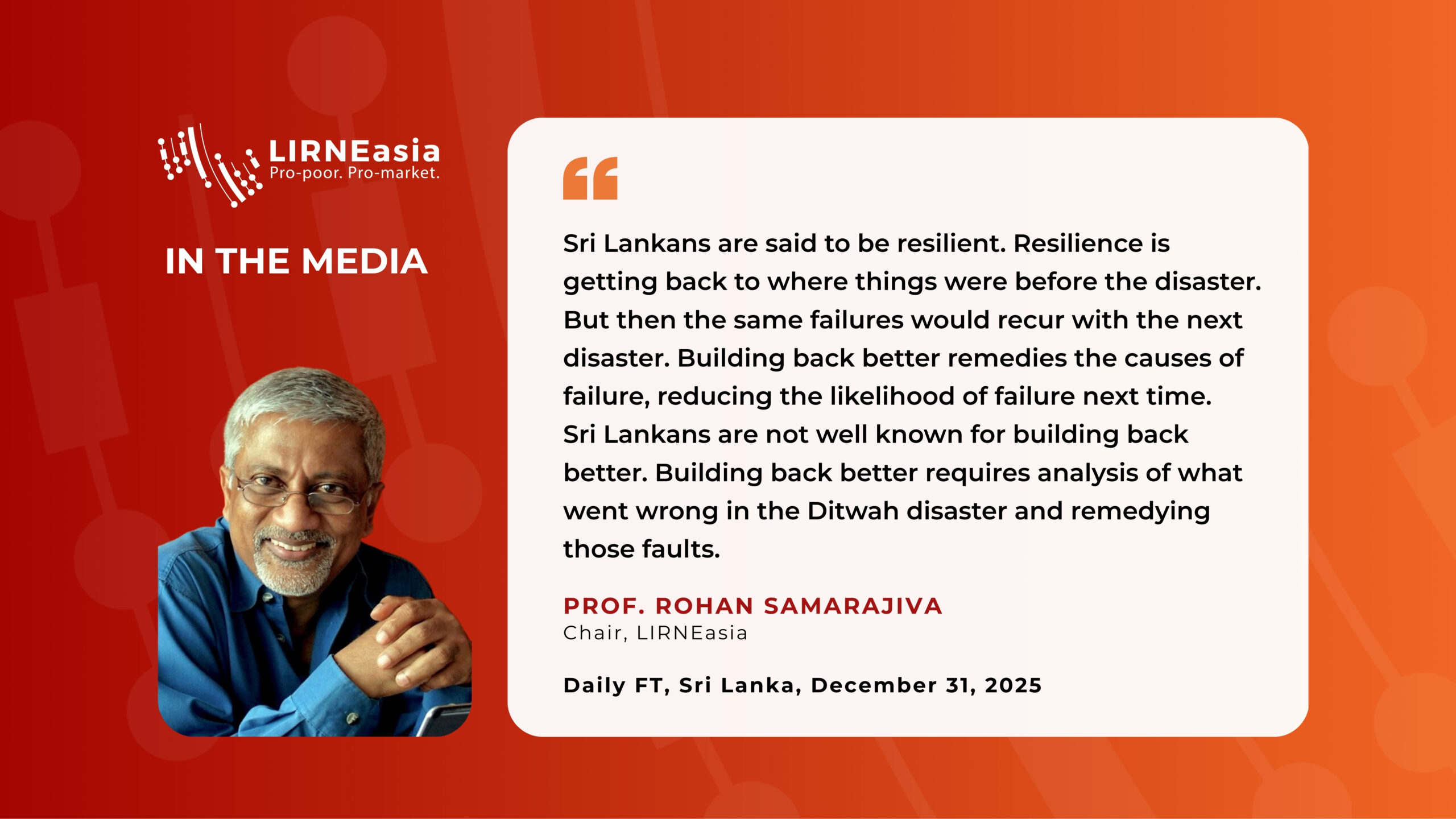 In an article published on 31 December 2025 in the Daily FT, LIRNEasia Chair Professor Rohan Samarajiva highlights how the Ditwah disaster exposed major vulnerabilities in telecom networks. He emphasizes that numerous telecom sites across the country were affected, leaving many districts without mobile or data services for days, which restricted access and delayed restoration efforts.