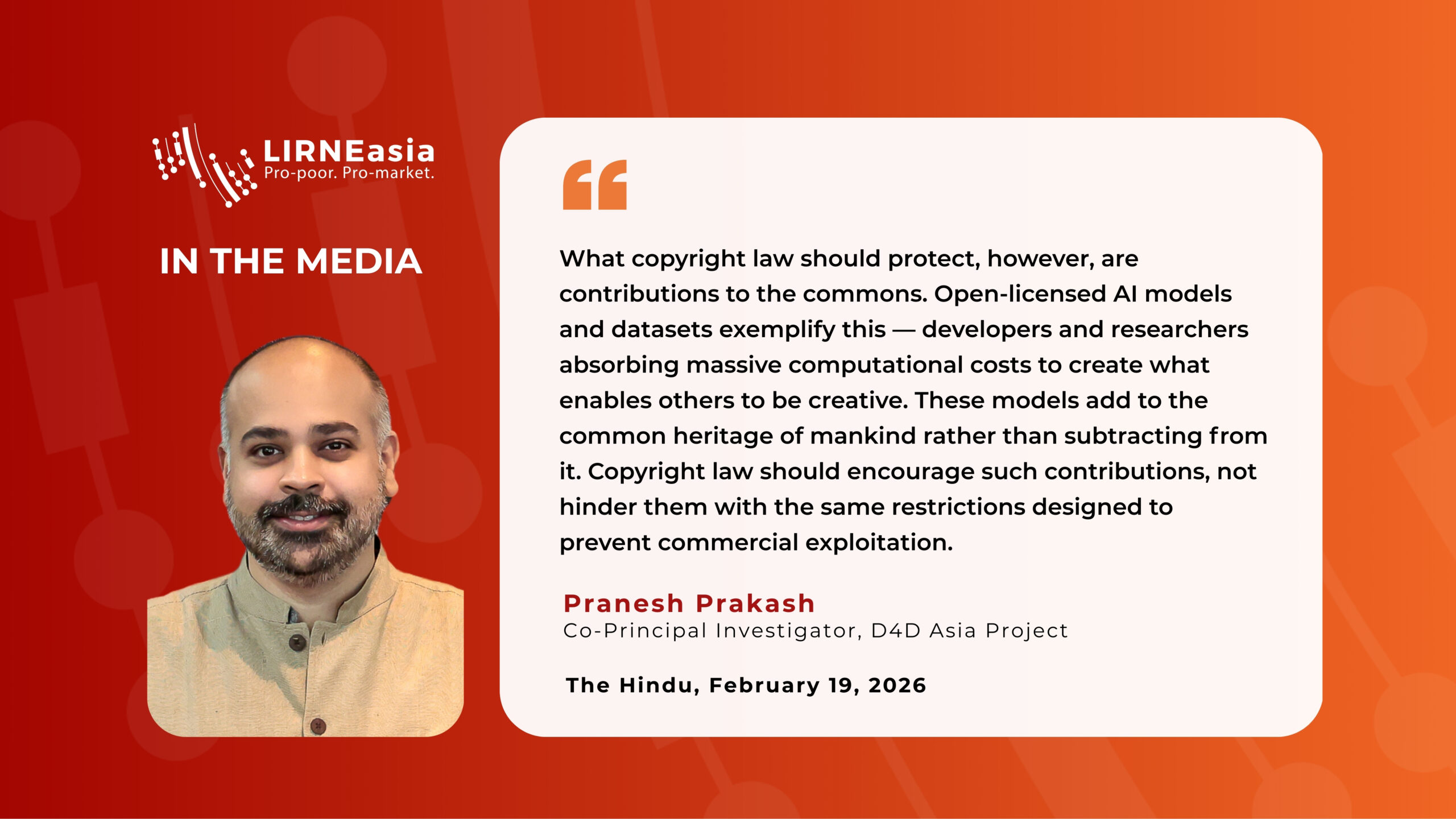 The rapid evolution of Artificial Intelligence is reshaping debates around copyright, accessibility, and innovation. In a recent article published in The Hindu, Pranesh Prakash, Co-Principal Investigator for LIRNEasia’s D4D Asia Project, discusses how copyright law must adapt to the realities of AI-driven technologies in a way that balances creators’ rights with the public interest. He argues that copyright has gradually drifted from its original purpose and has become a rigid system that sometimes restricts the creation and access to knowledge, innovation, and broader social benefit.