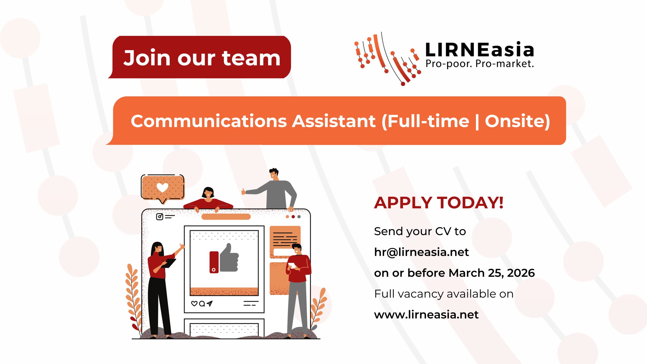 LIRNEasia is looking for a talented individual to join the team as a Communications Assistant. The full job description is available below. The deadline for applying is March 25, 2026.