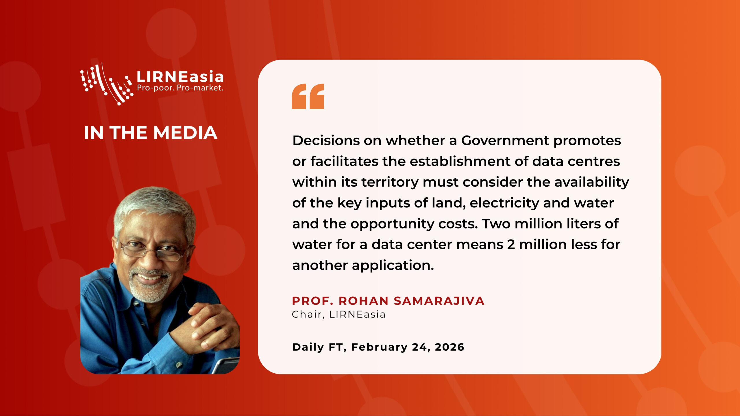 In an article published in the Daily FT on 24 February 2026, LIRNEasia Chair Professor Rohan Samarajiva questions the feasibility of this proposal, highlighting the significant infrastructure requirements and fiscal implications involved. He notes that data centres are not simple digital investments, but highly resource-intensive facilities that depend on reliable electricity, adequate land, water for cooling, and strong digital connectivity, including undersea cable networks.