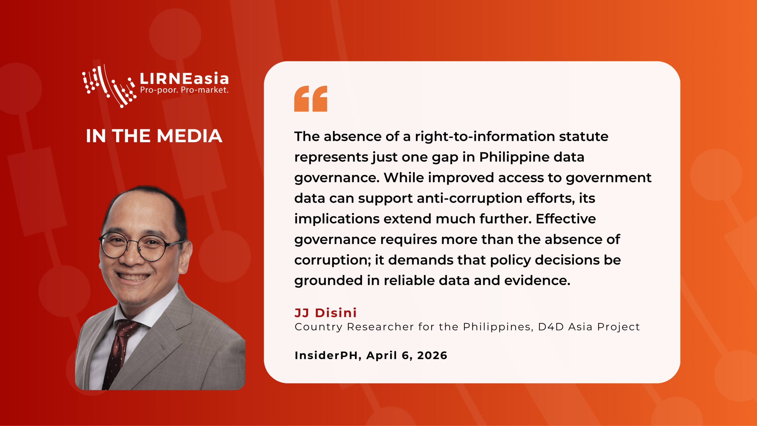 Even though the Constitution of the Philippines protects citizens’ right to access official records and research data used in policymaking, the absence of a comprehensive right-to-information law has left implementation subject to executive discretion. In a recent article published in InsiderPH on April 6, 2026, J.J. Disini, Country Researcher for the Philippines for LIRNEasia’s D4D Asia Project, highlights gaps in the country’s data governance framework despite constitutional guarantees of access to government information.
